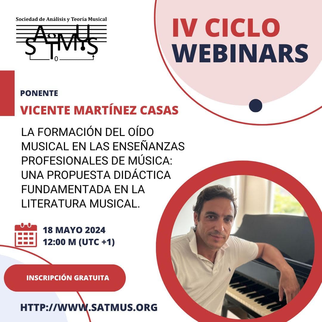 El sábado 18 de mayo, a las 12:00 del mediodía (hora de verano de Europa Central-Madrid, UTC+2) tendrá lugar el webinar titulado “La Formación del Oído Musical en las Enseñanzas Profesionales de Música: Una propuesta didáctica fundamentada en la literatura musical”, por el ponente Vicente Martínez Casas. Este webinar lo organiza el Grupo de Formación del oído musical de SATMUS y será presentado por una de sus coordinadores, Sofía Martínez Villar.
