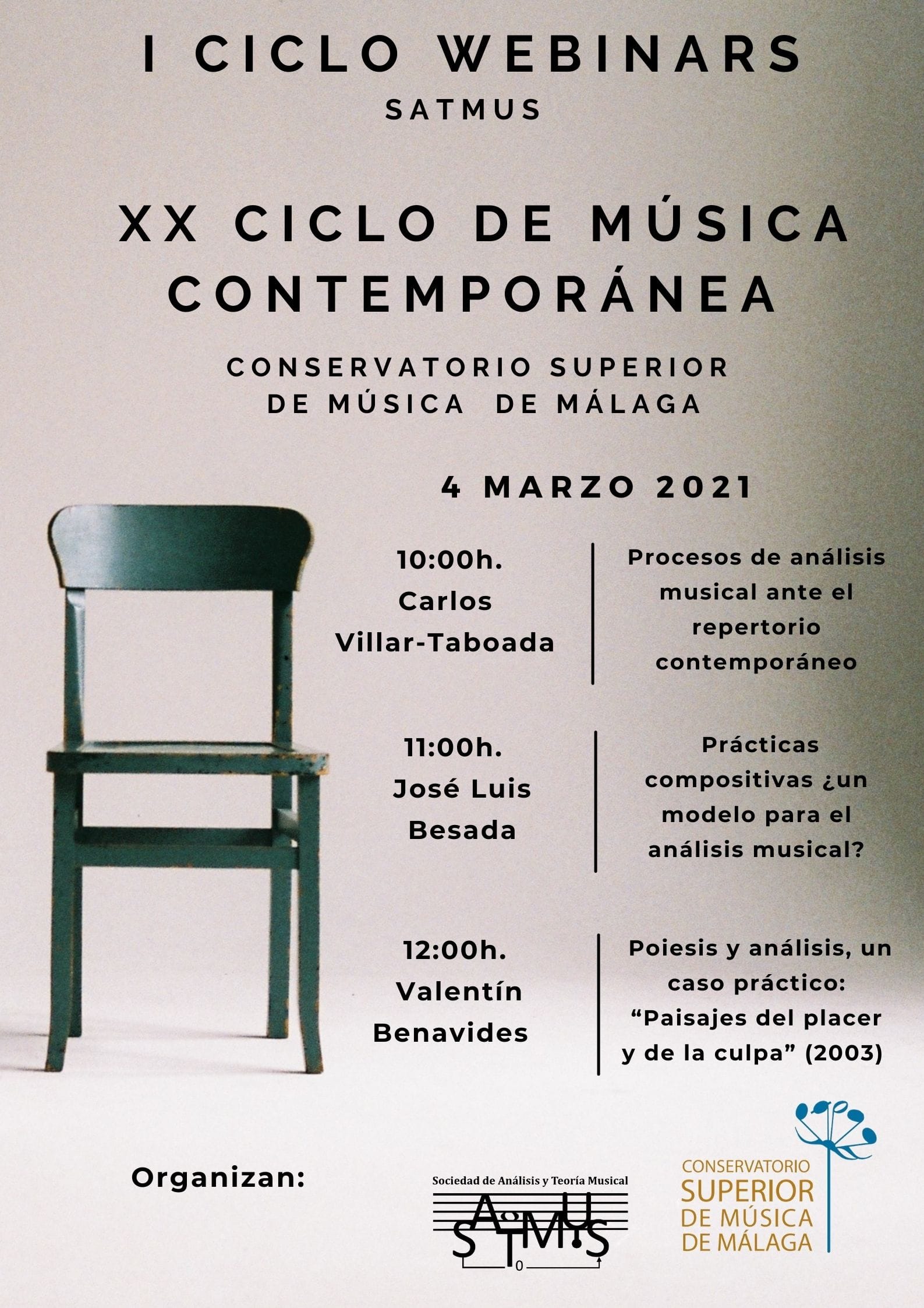 En esta ocasión, SATMUS ofrece estos webinars en colaboración con el XX Ciclo de Música Contemporánea del Conservatorio Superior de Música de Málaga, por lo que sus características serán ligeramente diferentes respecto al resto del I Ciclo de webinars SATMUS.